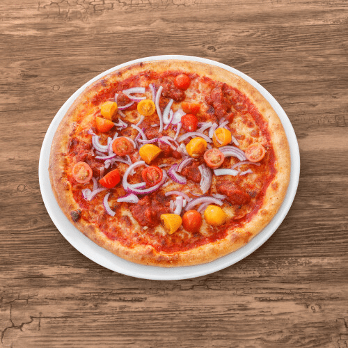 Tomatensaus, kaas, döner kebab, cherry tomaat en ui